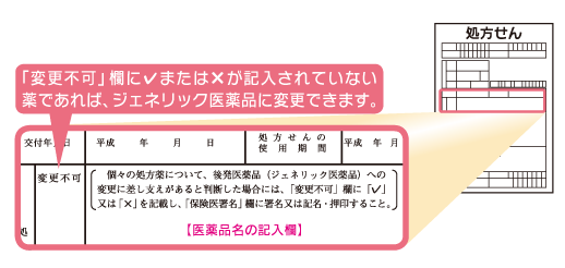 現在の処方せんは、薬ごとにジェネリック医薬品への変更の可否を明示するようになっています。また、薬の商品名ではなく、一般名処方※であれば、薬局でジェネリック医薬品を選ぶことができます。